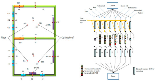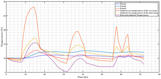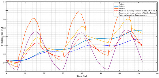 The heat transfer between the building envelopes and its outdoor and indoor environments is realized by convection and radiation. The thermo-physical parameters are estimated by referring to the literature and physical assumptions. Figure 4 represents 38 thermal points’ predictions that are determined by the simplified dynamic model in the case of PCM integration.