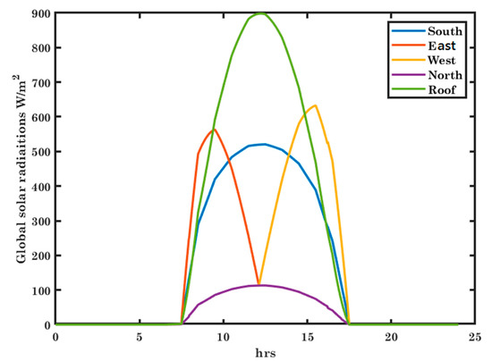 The meteorological data used were extracted from the hourly typical meteorological years) (TMY) Meteonorm database where different levels of global solar radiation that rose into the four facades (north, south, east, and west) were checked. Additionally, the ambient temperature and the wind speed were also useful in this work [13].