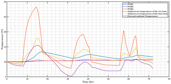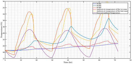Figure 6 represents the temperature dynamic behavior without the PCM integration cases, and it can be seen that the temperature profile is lower than the temperature profile of the PCM case integration.