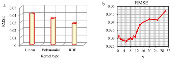 Root Mean Square Error (RMSE) statistics parameter via (a) KELM kernels function types and (b) γ values to find KELM optimums of testing set for the model M (V).
