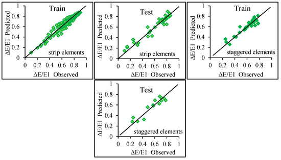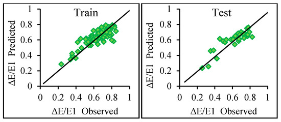 The obtained results for trapezoidal shape channel are listed in Table 4 and shown in Figure 5. In this case, the model M (V) with input parameters of Fr1, (y2-y1)/y1, W/Z was the superior model. According to the results, it could be seen that adding parameters (y2-y1)/y1, Z/y1, and W/Z as an input parameter caused an increment in the models’ efficiency. However, for this state, the variable W/Z was more effective than variables (y2-y1)/y1 and Z/y1 in improving the model accuracy. This issue shows the impact of the rough elements’ geometry on predicting the relative energy dissipation. From the comparison between the results of Table 3 and Table 4, it could be stated that the model developed for a rectangular channel with rough elements performed more successfully in predicting the energy dissipation than that of a trapezoidal channel with rough elements.