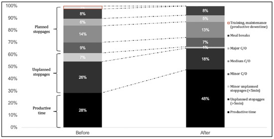 The ultimate form of the generated algorithm, represented in Figure 1, has been implemented in the pharmaceutical industry, at a manufacturing site. The designated manufacturing line for applying the algorithm was the bottle packaging line for suspensions where the Overall Equipment Effectiveness (OEE, internally treated as OAE—Overall Asset Effectiveness) needed to be increased as customer demand has been forecasted to continue growing over time and capacity constraint has already been reached. The algorithm, represented in Figure 1, has been validated by positively affecting the OAE KPI (Key Performance Indicator) which includes several additional CTQs (Critical To Quality), such as weekly unplanned stoppages time, weekly planned stoppage time and weekly/monthly output. Under the umbrella of OAE, challenges regarding P1–P4 were proposed to be solved. An OAE increase of 10% from a baseline of 25% to the new value of 35% would increase productivity by over 30%.