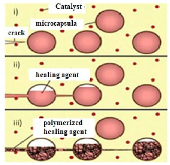 Basic method of approaching microcapsules: (i) formed in the matrix; (ii) crack breaks the microcapsules, releasing the healing agent into the plane of the fissure by capillary action; (iii) the healing agent comes into contact with the catalyst, triggering polymerization thus ensuring the closure of the close cracks [].