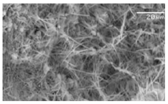 In another study [], a geo material with a SiO2 content of 71.3% and an Al2O3 content of 15.4% was added together with the expansive agent. Geopolymers were found to be formed by polymerization of individual species of alumina and silicate, which were dissolved from their original sources at high pH in the presence of alkaline metals. Detailed studies showed that the size of the geopolymeric gel was less than 2 µm and that the interface phases of the cracks of the initial cracking area formed several phases of hydrogarnet. It indicated that the phases of hydrogarnates or phases AFt, (Figure 3) were formed of an expansive agent and therefore played an important role in the cracked materials. The EDS analysis also showed that most of the modified geopolymeric gel was structured by dense phases compared to the hydrogarnate phases. Chemical admixtures have also been studied in this research series [,]. It was concluded that the addition of carbonates such as NaHCO3, Na2CO3 and Li2CO3 to normal concrete contributed to increased recrystallization of cementitious particles and precipitated particles into concrete. In particular, when using the appropriate dosages of carbonates and the expansive agent, the self-healing capacity of the cracks could be improved.