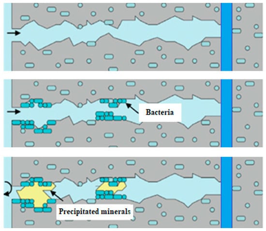 Schematic scenario of healing cracks by bacteria immobilized in concrete. Bacteria on the fresh surface of the fissure become activated due to water ingestion, begin to multiply and precipitate minerals such as calcite, seal the crack and protect the steel reinforcement from external chemical attack [].