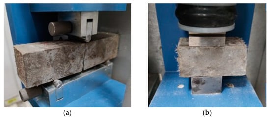 Tests regarding the mechanical properties of the material were performed at 28 days, on 40 × 40 × 160 mm samples to obtain flexural and 1600 mm2 samples for compressive strength (Figure 6).