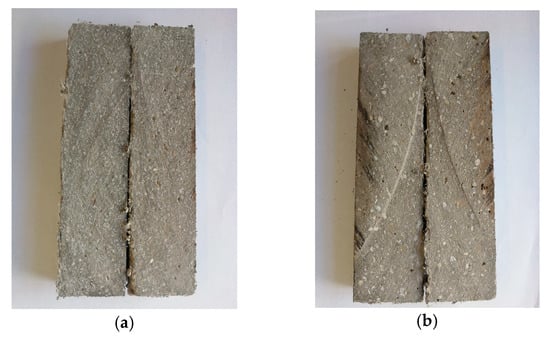 Three specimens were cut in halves and tested for the evaluation of the microcracks (Figure 7). To evaluate the self-healing capacity of the micro-concrete, the specimens after being tested were microscopically analyzed using a LEICA DMC 290 Microscope. The specimens after being tested [] at 28 days were microscopically evaluated with measuring the microcracks and were subjected to 28 cycles of wet/dry. The wet/dry cycles were 12 h immersed in water and 12 h in air in laboratory conditions ((20 ± 2) °C and (50 ± 3)% RH) and after 28 days were microscopically reanalyzed. The microcracks width was measured before and after the conditioning of the specimens in order to evaluate the self-healing capacity.