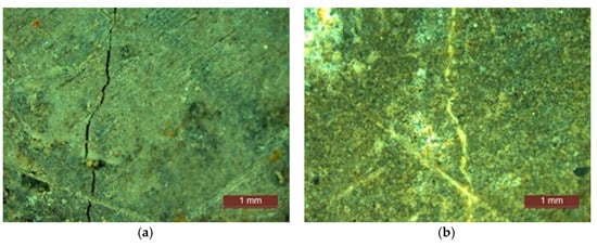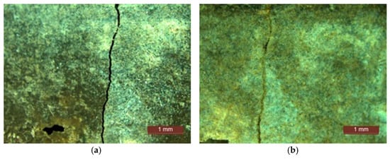 The self-healing capacity of the samples was also tested by subjecting the samples presented in Figure 7 to a 3PB test in order to generate cracks on the surface of the samples, after which the samples were microscopically analyzed. After that, the samples were subjected to 28 wet/dry cycles (12 h immersed in water/12 h in air) and resubjected to microscopical analysis (Figure 9 and Figure 10). Consequently, for all the samples, at each stage, the mean width of the microcracks (wmed) was measured as a parameter of the self-healing capacity (Table 4).