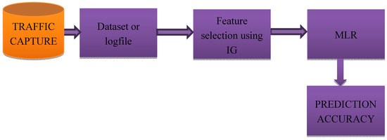 The fundamental research objective behind the proposed method is to design a machine learning model based on multiple linear regression analysis and also perform data visualization by considering residual plots and fit charts. The idea behind the proposed approach is to study the possibility of applying multiple linear regression analysis to the CICIDS 2017 dataset which is the benchmark dataset widely used in some of the most significant recent research studies. The objective is to first apply the feature selection technique and determine the important attributes that are better deliverables for the prediction model. In the present approach shown in Figure 2, we have used the Information Gain approach method for carrying feature selection. Information Gain approach is a widely applied model in several data mining-based applications. The selected features are then considered for carrying multiple linear regression analysis, and the behavior of chosen and retained important attributes of the CICIDS 2017 dataset is studied by analyzing the fit charts and residual plots.The next subsection gives the experiment result analysis using the proposed approach by considering Friday log files of the most popular CICIDS 2017 research dataset.