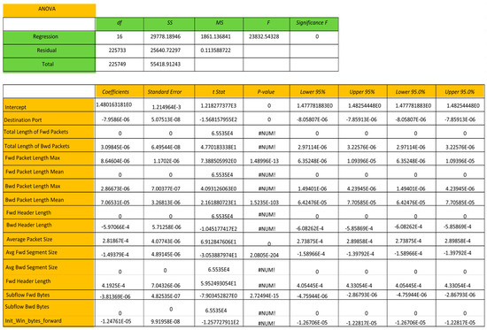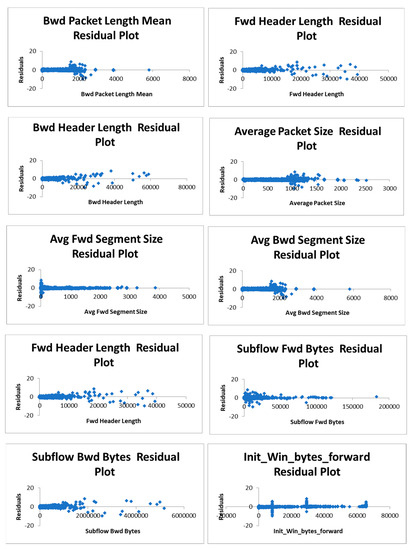 Figure 5 shows the residual plot obtained for each of the 16 attributes of the CICIDS 2017 dataset w.r.t Friday afternoon log file. Figure 6 shows the residual plot and Figure 7 shows the fit chart for the overall multiple linear regression model. After the initial model is developed, then, we have eliminated 10 attributes which are not statistically significant and retained the remaining sixattributes. So, the number of attributes is now reduced to sixattributes. The attribute dimensions are 1, 9, 13, 53, 54, and 64. Then, the multiple regression analysis is performed once again on these statistically significant attributes. Figure 8 depicts the fit chart, visualizing the actual label and predicted label. Figure 9 shows these six attributes’ residual plots and finally, Figure 10 depicts the residual plot for the model. Thus, the machine learning model accuracy obtained using these six attributes is 71.6% which also clearly shows that the first model with 16 attributes is comparatively better.