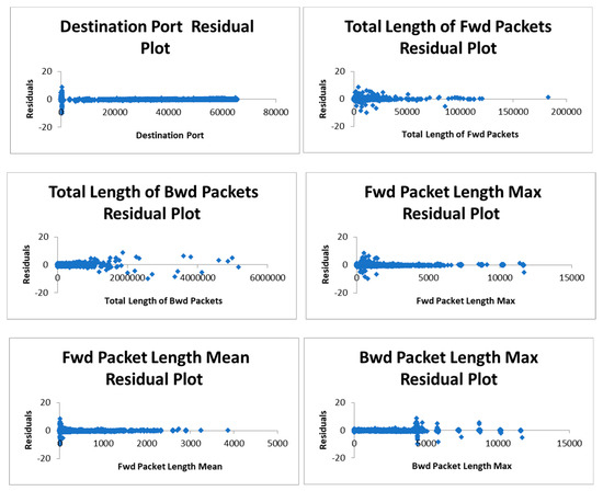 Residual plots for sixattributes of Friday afternoon log of CICIDS 2017 dataset.
