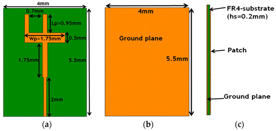 The geometry of the antenna: (a) ground plane, (b) bottom view and (c) side view.