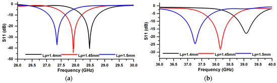 The reflection coefficient with variation of Lp: (a) at 28 GHz band and (b) at 38 GHz band.