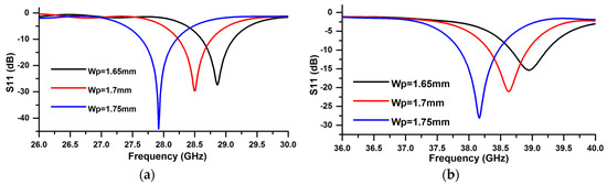 The reflection coefficient with variation of Wp: (a) at 28 GHz band and (b) at 38 GHz band.