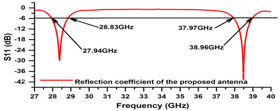 The reflection coefficient for the single element of the 5G antenna is shown in Figure 4. The two operating bands of the antenna are obtained: the first band (S11 < −6 dB) from 27.94 to 28.83 GHz with a width of 890 MHz and the second band from 37.97 to 38.96 GHz with a width of 990 MHz. The two bands obtained cover millimeter-wave frequency bands for future mobile cellular devices.