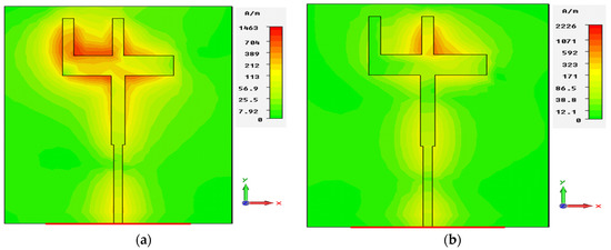 To understand the operating mechanism of the antenna, the surface current distribution at both operating bands was studied. The surface current distributions of the 5G antenna at 28.38 and 38.49 GHz are shown in Figure 5a,b, respectively.
