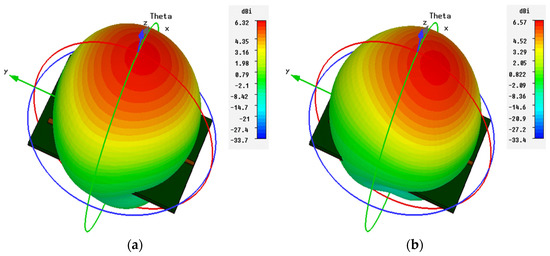 The 3D radiation pattern of the single element “inverted-F” antenna at 28.38 and 38.49 GHz are illustrated in Figure 6a,b, respectively. The obtained results showed that the “inverted-F” antenna had a good end-fire radiation behavior and a gain of 6.22 dB at 28.38 GHz and 6.33 dB at 38.49 GHz.
