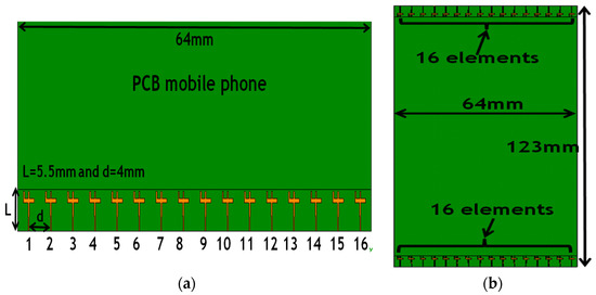 The chosen configuration for the application is a 32 array element with identical elements. Figure 7 shows the geometry of the linear array with 32 elements of the “inverted-F” antennas. The 16 array elements are chosen to be placed in the top portion of PCB, while the other 16 elements are placed in the bottom portion of the PCB. For uniformly spaced linear arrays, the elements have 4 mm spacing between them (0.795λ at 28.38 GHz and 1.076λ at 38.49 GHz). The PCB size is 133 × 64 × 0.2 mm3. The array antenna has been designed, optimized, and simulated using the CST microwave studio.