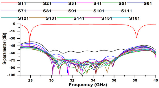 The simulated S-parameters for the array antenna are illustrated in Figure 8. From this figure, we can see that the array antenna exhibits good impedance matching in the 28/38 GHz frequency bands and the mutual-coupling characteristics between the elements are less than −35 dB.