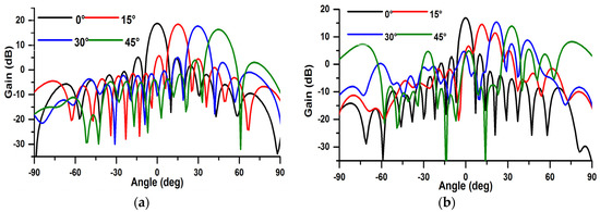 The Cartesian gains of the array antenna in x–z plane are displayed in Figure 9. As illustrated, the array antenna has a good beam steering characteristic with end-fire mode and sufficient gains at different scanning angles.