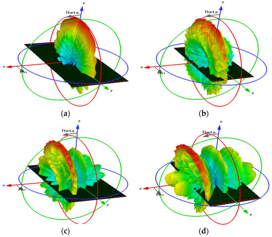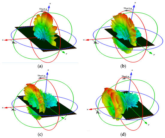 The 3D radiation beams in 28 GHz band at different scanning angles; (a) 0°, (b) 15°, (c) 30° and (d) 45°.