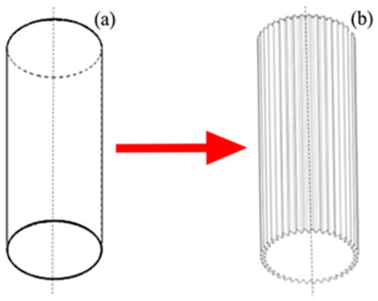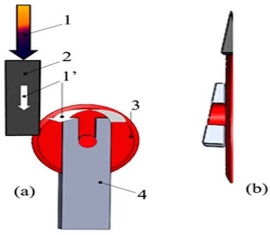 The aspect of the “slice” subjected to simulation ((a)—longitudinal view, (b)—cross-sectional view, 1—the moving force, 1′—the direction of movement, 2—the semi-finished product, 3—the deforming rollers, 4—the body of device).