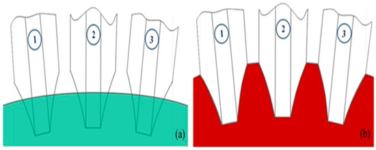 Cross-sectional view of the processed semi-finished product: (a) the initial semi-finished product (green) and (b) the final product (red); the forming rollers are numbered as 1, 2, 3.