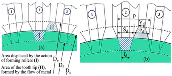 Basically, the diameter Ds of the semi-finished product and its height Hs were determined. The mathematical calculation of the diameter Ds of the semi-finished product implies that the sum of the transverse areas of the portions displaced by the action of the forming rollers must be equal to the sum of the transverse areas of the tooth tips formed by the flow of the material [4] (see Figure 6).