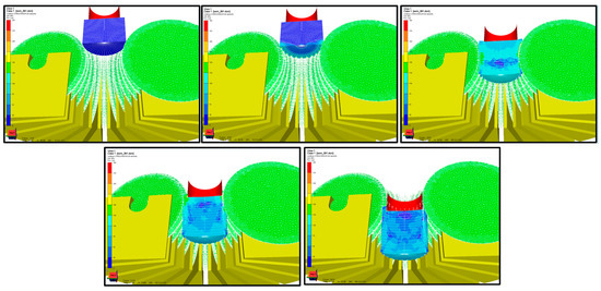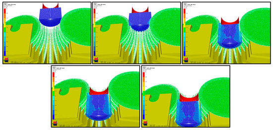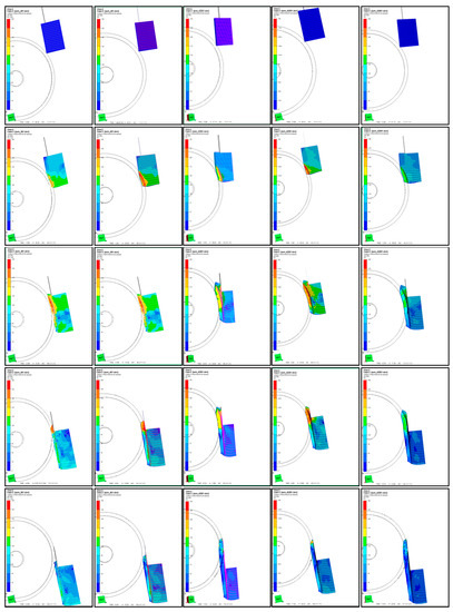 This simulation is similar as aspect to the previous one, practically focusing on the amplitude of the deformations of the semi-finished product along the entire time interval (t) of its deformation, as shown in Figure 10.