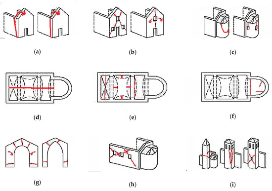 Failure mechanisms in Romanesque churches: (a) overturning of the facade; (b) shear mechanisms in the facade; (c) overturning of the apse; (d) transversal vibration of the nave; (e) vaults of the nave; (f) vaults in the presbytery or the apse; (g) triumphal arch; (h) shear failure of the walls; (i) bell tower.