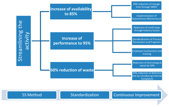 In order to achieve the proposed objective, the main objective was cascaded into secondary objectives, all based on the implementation of the 5S method, standardization, and continuous improvement (Figure 2):