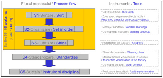 The implementation flow of the 5S Method (sort, set in order, shine, standardize, and sustain) on each workstation is represented in Figure 3: