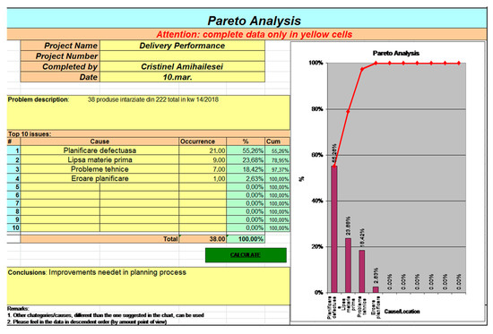 As the first solution to improve the planning process, an Excel file for electronic planning management was proposed and developed, which, in addition to the much more accurate storage of information, allowed analysis of the planning process. Every day, the reason for delaying the delivery of a product was documented in the file. Some examples were the following: