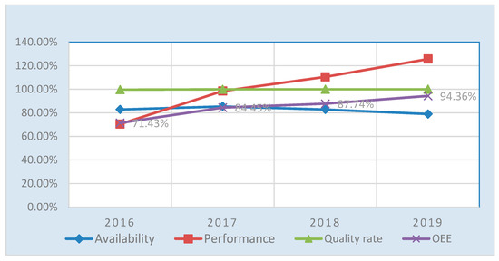 The OEE not only reached the set target, but significantly exceeded it, with an average of 87.74% in 2018 and 94.36% in the first 4 months of 2019 (Figure 7).