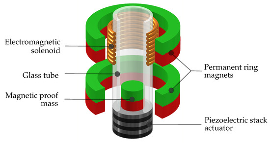 We consider the cooperative microactuator system shown in Figure 1, where a magnetic proof mass within a glass tube can move between two equilibrium positions, namely resting on top of a piezoelectric stack actuator and levitating at a predefined upper position. This corresponds to the design presented by Schütz et al. [13], but with the extension of a second permanent magnet and the stack actuator. Starting at the lower equilibrium, the inverse piezoelectric effect is used to apply an impulse-like acceleration, i.e., a kick, to the proof mass. This is followed by a controlled electromagnetic catch at an upper equilibrium position, where the mass is stably suspended by the permanent magnetic field.