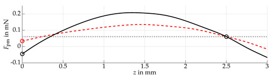 The equilibrium positions correspond to the intersection of the mirrored gravitational force with the magnetic and contact force characteristics. These are locally stable, if additionally, the force gradient is negative. Due to the counterforce of the stack actuator at the zero position, the stability criterion at this point is simplified, i.e., the point is stable if the magnetic force is lower than . This corresponds to the mass being pushed against the piezo actuator. For both setups shown in Figure 2, the resting positions are located at and , and their robustness depends on the force steepness around that point. A steep force is able to counteract small deviations, pushing the proof mass back into the resting position. In the case of the flat curve, the positive magnetic force compensates most of the gravitational force at the lower position. Thus, a small positive force disturbance is sufficient for the proof mass to inadvertently leave its equilibrium. Therefore, robust equilibria are preferred. However, the energy effort for the transition between these points increases with robustness, since larger counterforces have to be overcome. Thus, a trade-off has to be found. These and similar contradictory goals can be handled by simultaneously optimising the system and the controller in a co-design.