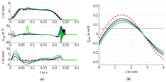 Flatness-based following control with model uncertainty is implemented. (a) The feedback controller is mostly able to compensate the model differences, but for the largest magnetic field deviation (solid, green), the position of the proof mass briefly coincides with the solenoid centre. The dashed, red line corresponds to the reference. (b) In each simulation, the magnetic force deviates more from the reference (dashed, red).