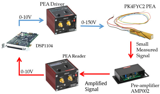 Figure 1 shows the hardware architectures in which the control strategies were embedded in a dSpace DSP1104 that provided a 0–10 V signal, which is sent to the PEA driver cube (KPZ101 by Thorlabs); this hardware amplifies the signal of 0–150 V straight into the PEA. The measurement is done in two steps: the strain gauge measurement is augmented in a pre-amplifier AMP002 and linked to a strain gauge reader KPZ101 by Thorlabs. The latter provides a 0–10 V measurement signal, which is used in the DSP1104 hardware for control purposes.