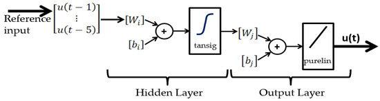 The first architecture used for mapping the PEA non-linearity was a Time Delay Neural Network (TDNN), which is a recurrent ANN [18] type. The structure implies that the predicted output depends on the past values of the input (which was set as 5 by default) and merged with a non-linear function f, as shown in Equation (1). The function f was approximated by a non-linear combination of a hidden and output layer with its activation functions and weights. Figure 3 displays the architecture of the TDNN where both layers have different weights and biases (in terms of i and j). The configuration of the ANN was disposed as the one used by the author in [14] where the number of neurons in the hidden layer was 22. The training information was set as 10 seconds of triangle waves, which reflected the PEA displacement and voltage as the input and output, respectively. Furthermore, the data were divided into 70% for training, 15% for validation, and the rest for testing. The training algorithm used was Levenberg–Marquardt (LM) as the MATLAB ANN Toolbox suggests; the calculation was carried until acceptable values of the Mean Squared Error (MSE) were achieved.