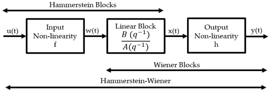 As Figure 4 shows, HW consists of three blocks in series where the outer ones are used to map the input and output non-linearities, whereas the middle block is a linear function (Equation (2)) in terms of the time shift operator q 1 , such that q 1 u ( t ) = u ( t T ) . The parameters n b , n f , and n d represent the degree of B, F, and the delay, respectively.