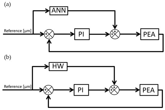 In this research, we use a PI controller whose parameters are optimized by the reduction of the IAE; moreover, an ANN and HW are designed in MATLAB/Simulink, contrasted, and tested individually in a control architecture with a PI. In Section 2, the hardware configuration is explained within the PEA specifications followed by a shallow description of the hysteresis and the control structures used during the experiments. Section 3 provides the results of the hysteresis fitting that the ANN and HW provide; also, the errors and actuation signals are interpreted for the control architectures. Finally, Section 4 provides a summarize of the whole research and which future strategies could be analyzed.