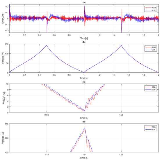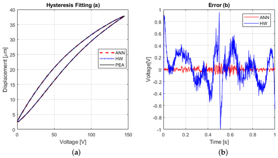 The PEA hysteresis is obtained with a triangle wave, which is a complex signal and implies that the control design has to be robust enough. Therefore, a comparison between HW and the ANN is done to verify the mapping accuracy. HW shows low performance in comparison with the ANN since the error has more fluctuation and could carry the peak with certain difficulties. The ANN has an increment in the accuracy that is near the null value of error on average.