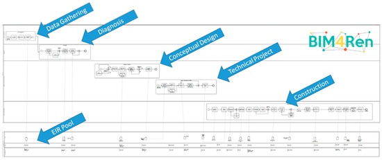 On the other hand, the rest of specific BPMN workflows in Table 1 specify the tasks (subprocesses) involved in the lifecycle phases from the point of view of the stakeholders. For example, the BPMN diagram displayed in Figure 2 expands the generic diagram with the detailed tasks and Exchange Information Requirements (EIR) from the point of view of the architect in the façade renovation process in the BIM4Ren San Sebastian pilot (ID2).