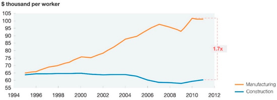 “Sustainability” of the built environment first means saving energy by becoming more efficient. If we compare the productivity trend of the construction industry with the manufacturing one, as in Error! Reference source not found.Figure 1, it is clear that it is possible to improve significantly.
