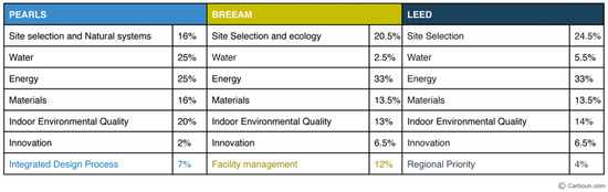 International sustainability protocols have some differences, but common categories can be identified. Figure 2 [4] identifies the incidence of credits of different categories in three different sustainability protocols.
