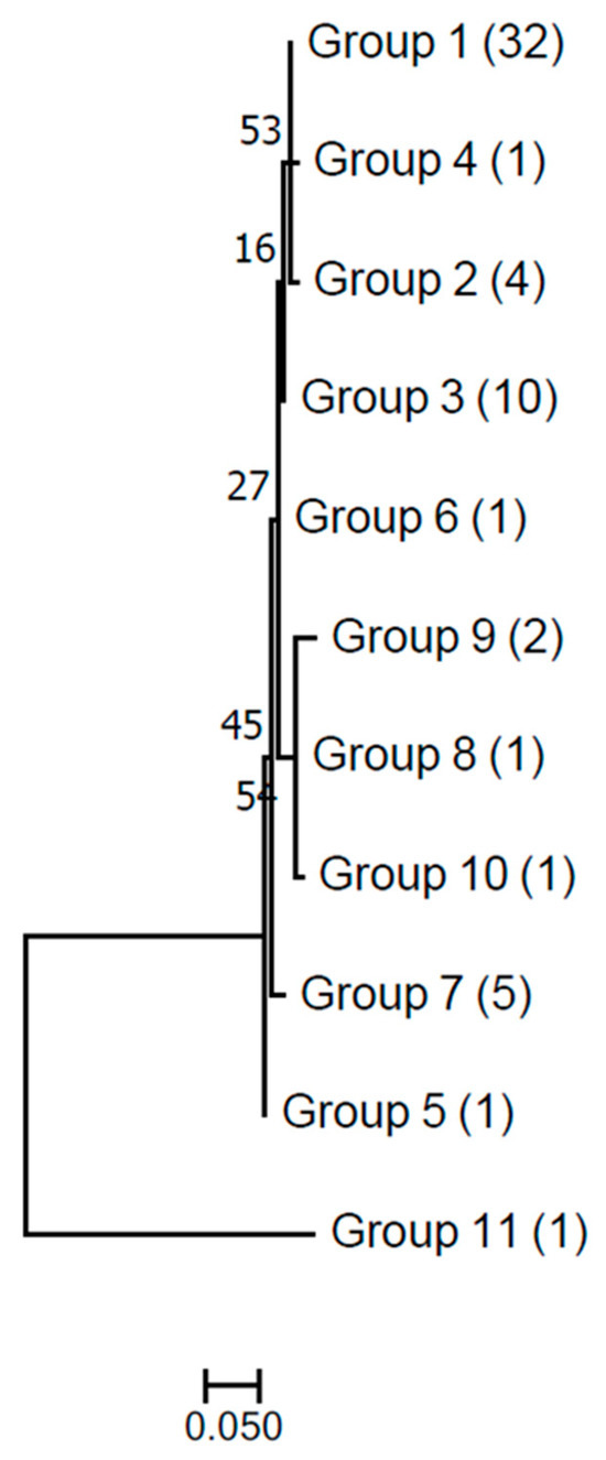 - Kumar, S.; Stecher, G.; Tamura, K. MEGA7: Molecular Evolutionary Genetics Analysis Version 7.0 for Bigger Datasets. Mol. Biol. Evol. 2016, 33, 1870–1874. [Google Scholar] [CrossRef] [PubMed]