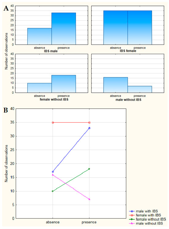 (A) Histograms representing an occurrence of the RHOM_14625 gene fragment among the studied groups. (B) Interaction plot shows the difference between the frequencies of the RHOM_14625 gene fragment occurrence in the studied groups. The association is seen between: (i) females with IBS and males with IBS; (ii) females with IBS and females without IBS; (iii) females with IBS and males without IBS.