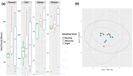 The characterization of the microbiota in human milk at different sampling times of the day showed significant changes in the bacterial alpha diversity according to the Shannon diversity index (p = 0.022); however, no significant changes were detected in the bacterial richness evaluated by observed number of species (p = 0.861), Chao 1 (0.846), or in the dominance by Simpson index (0.449) (Figure 1a). This difference in the diversity was detected between the morning sampling time and the night. Conversely, no differences were observed in the bacterial composition or diversity (alpha and beta diversity) of the afternoon group compared with the morning and night sampling time groups (Figure 1a,b).