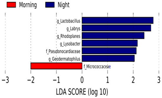 Represented significant bacterial taxa for each time of the day. Linear discriminant analysis (LDA) effect size (LEfSe) comparison of bacterial taxa between human milk morning samples and night samples. Horizontal bars represent the effect size for each taxon: red indicates taxa enriched in the morning group and blue indicates taxa enriched in the night group. LDA score cutoff of 2.0.