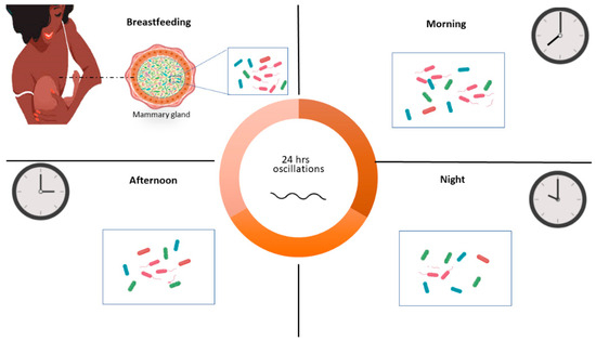 Circadian rhythms are present in almost every organism in response to continuous changes in light as a result of the rotation of the planet around its axis [1]. Some reports describe the presence of photosynthetic bacteria in this rhythmic process; however, the circadian clock operates in non-photosynthetic bacteria too, such as those of the intestinal microbiota [2]. The gut microbiota composition and diversity are sensitive to changes in the environment of the host, such as the circadian cycle [3]. Many of these bacteria display oscillations throughout the day, regulated by the host feeding times and sleep cycles, contributing to homeostasis, and participating in several physiological processes [4,5]. Likewise, in human milk there are beneficial bacteria that are transferred to the newborn by breastfeeding, colonizing the gastrointestinal tract [6]. In addition, other studies suggest that some components of human milk, such as proteins, nucleotides, and vitamins, among others, undergo diurnal variations in the same way the gut microbiota do in both mice and humans [4,7]. We believe that in human milk, these oscillations enhance the well-being of the breast-fed infant.